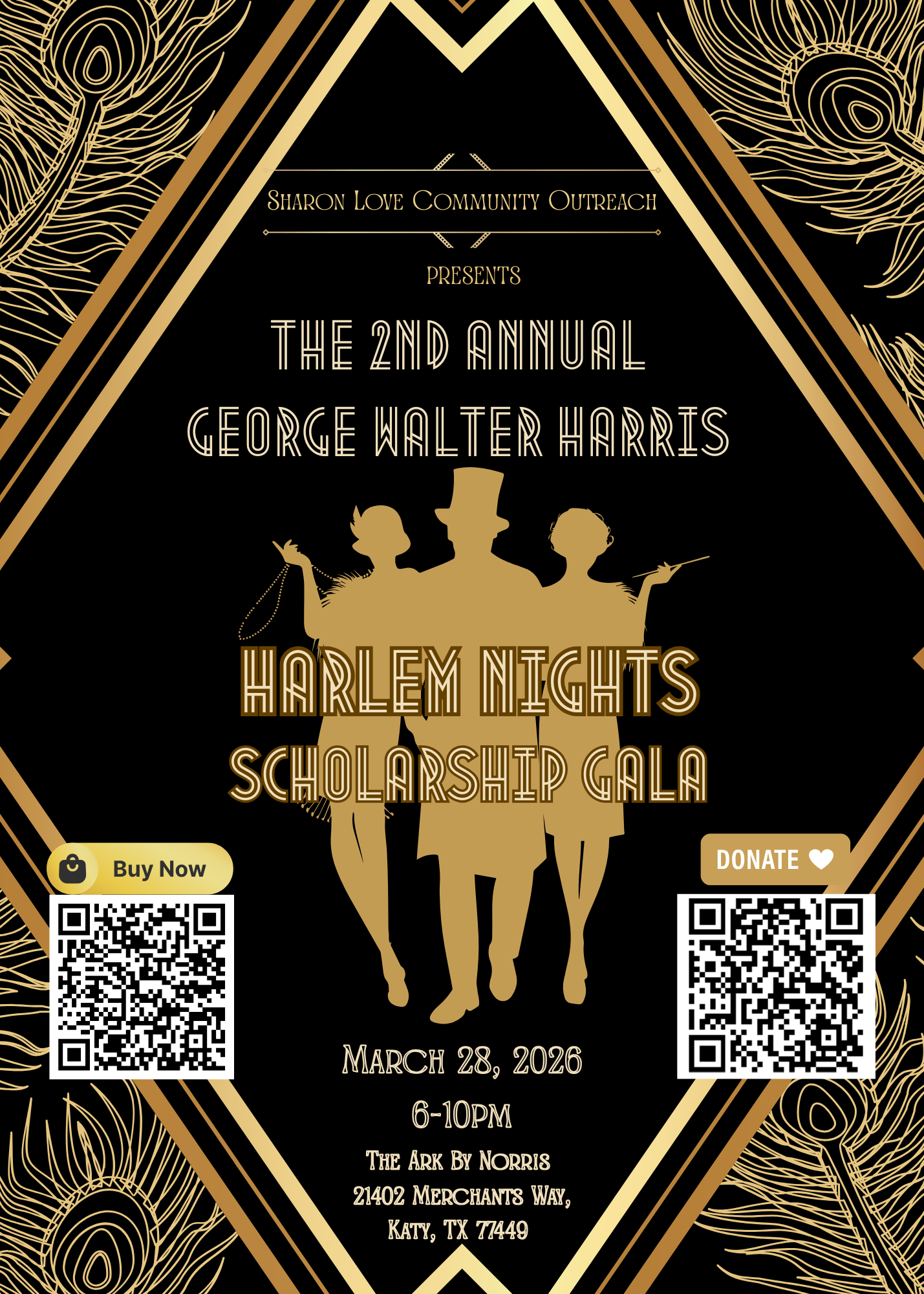 The Ark Venue 21402 Merchants Way, Katy, TX 77449Join us for the George Walter Harris Scholarship Gala—an uplifting evening celebrating our graduating seniors and scholarship recipients. Enjoy great food, music, a raffle, silent auction, and a night dedicated to honoring legacy. All proceeds support Sharon Love Community Outreach’s Scholarship and College Tour Program Fund.